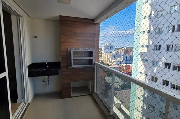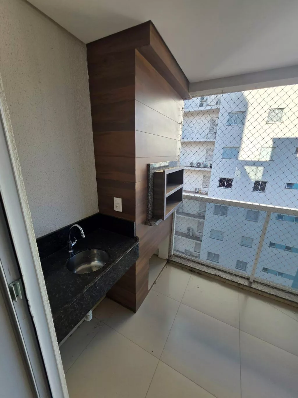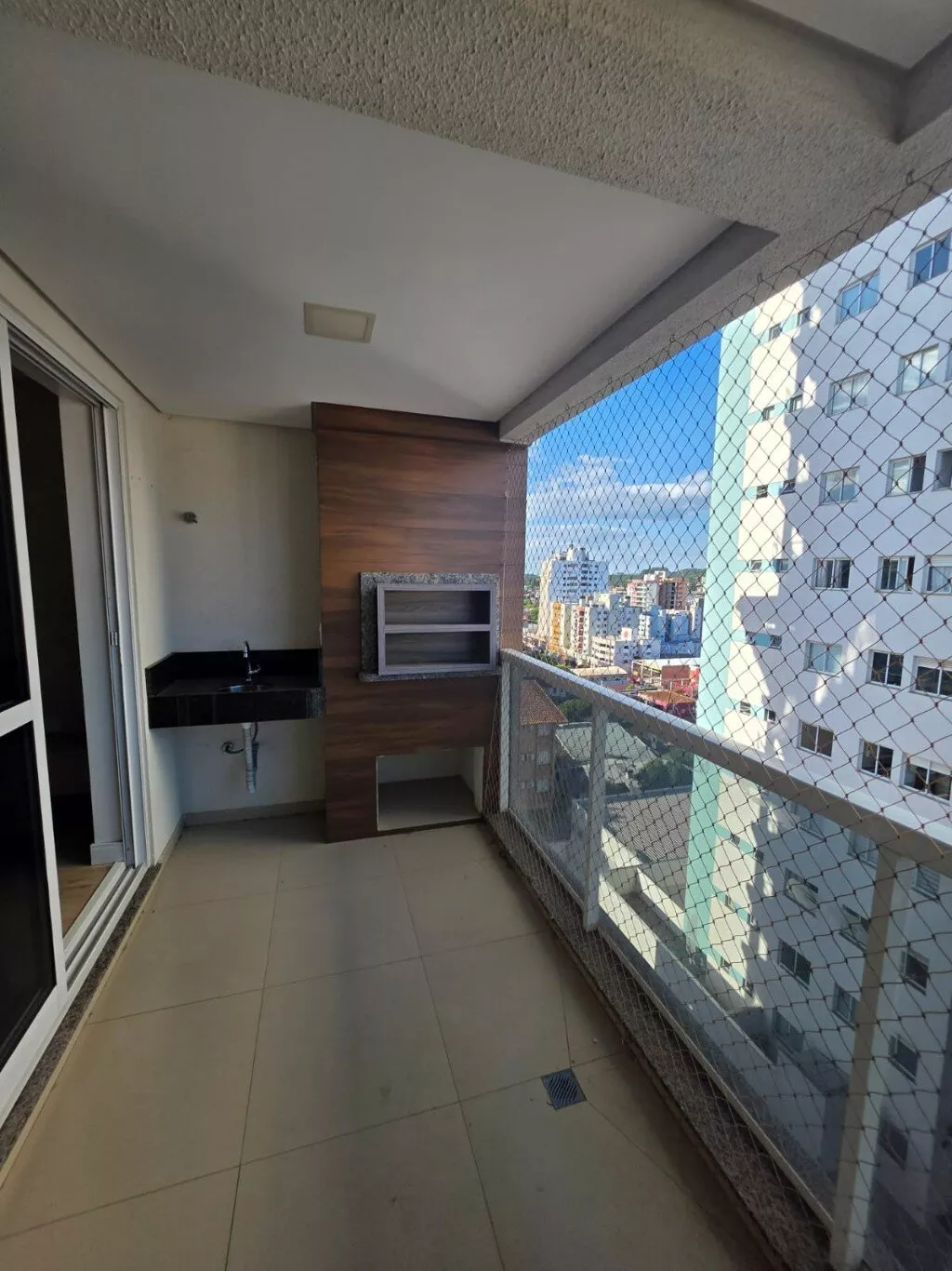 Sacada com churrasqueira e vista para a cidade.