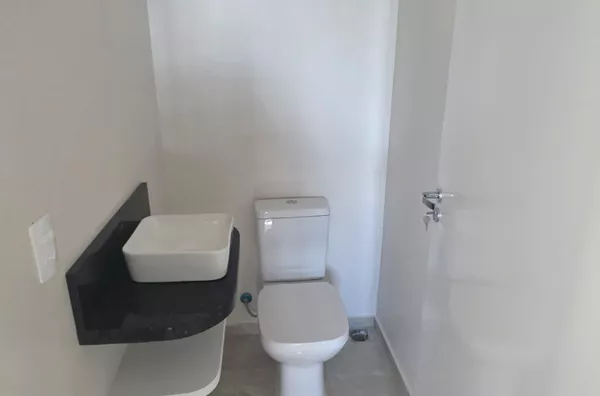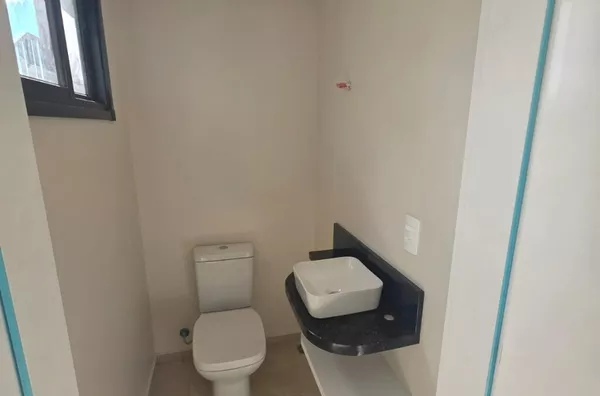 Salão de festas com churrasqueira e lavabos no pavimento inferior